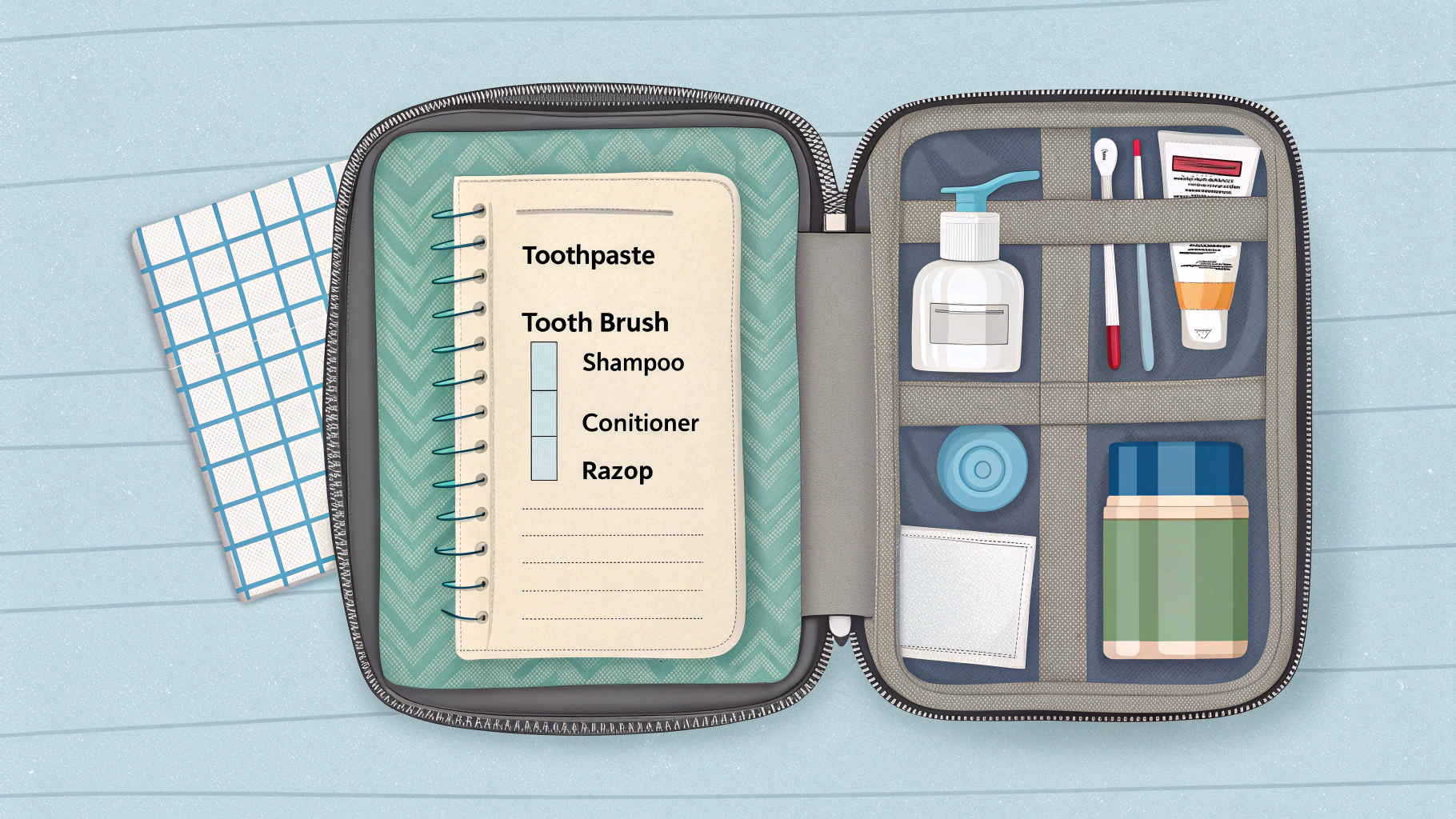 toiletry bag packing checklist showing organized compartments and essential items